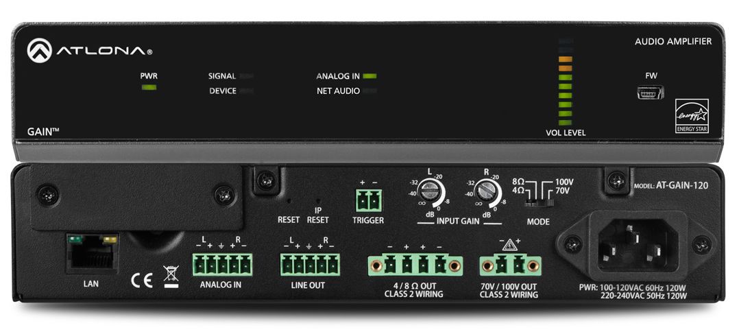 The Atlona Gain™ 120 (AT-GAIN-120) is a compact power amplifier designed for low or high impedance applications. A mode selector switch allows the Gain 120 to deliver two channels of 60 watts each into 4 or 8 ohms, or a single channel of 120 watts at 70 or 100 volts. This Class D amplifier is energy efficient and ENERGY STAR qualified, and is also convection cooled to allow installation in conference rooms and quiet installation environments without the need for fans. In addition to the amplified speaker output, a line level audio output allows the incoming audio to be fed into an additional amplifier or audio system. The Gain 120 is controllable via TCP/IP or external trigger, and can be integrated with Atlona AV switchers and OmniStream™ AV systems for a wide variety of sound reinforcement applications.