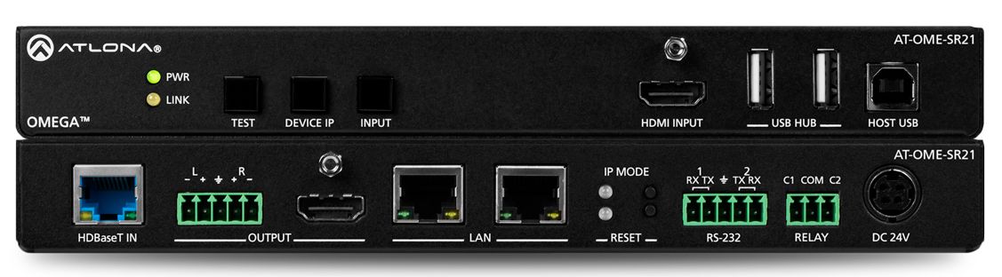 The Atlona AT-OME-SR21 is an HDBaseT receiver and 4K/UHD scaler with a local HDMI input. Part of the Omega™ Series of integration products for modern AV communications and collaboration, the OME-SR21 receives HDBaseT for video, control, Ethernet, and USB.Read More