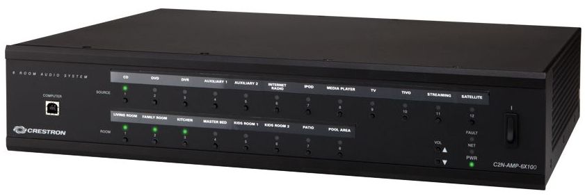 The Crestron® C2N-AMP-6X100 is a versatile and cost-effective multiroom audio system designed for small to moderate sized houses, condominiums, and businesses. Its integrated multichannel power amp provides ample power for up to six rooms, which can be expanded simply using additional C2N-AMP-6X100 units, or by connecting external amplifiers via the two extra line-level room outputs. Twelve stereo line inputs are included to accommodate a rack full of music and AV sources. With many of the same pro features as Crestron’s more expensive systems, the C2N-AMP-6X100 lets everyone enjoy their own choice of music, sports, news, or talk in any room as part of a complete Crestron system.
