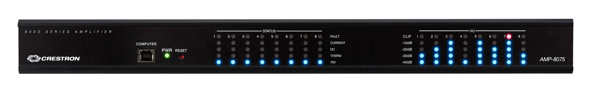 Crestron® Avia™ AMP-8000 series amplifiers are designed to complement the Avia family of digital signal processors, and are well-suited for all types of commercial audio applications. Each model furnishes eight channels of clean, efficient amplification in a space-saving 1 RU rack-mountable chassis. Each channel is configurable for Lo-Z or Hi-Z operation, as well as stereo and bridged modes. Network connectivity enables configuration, monitoring, and control via the Avia Audio Tool software, a Crestron control system, or Crestron Fusion®.